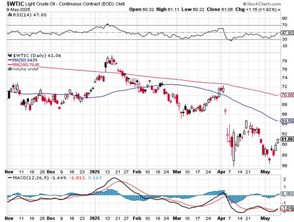 Natural gas [chart included] jumped higher by 19 cents...closing at $3.79/1,000 cubic feet -- and is now back above its 50-day moving average by a bit. WTIC picked up its second decent gain in as many days, as it closed up another $1.15 at $61.06/barrel.