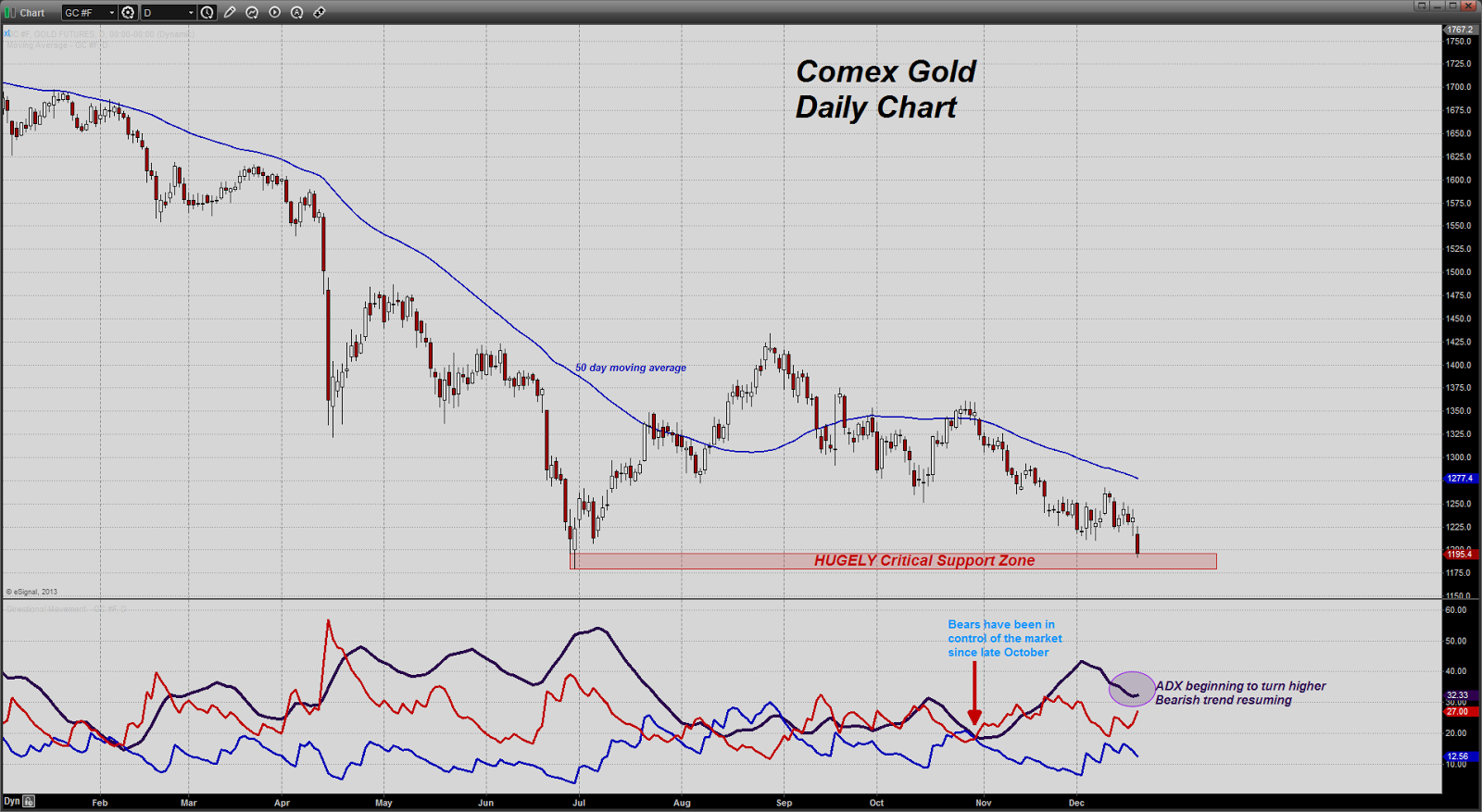 I have put up a Daily Chart to illustrate how tenuous gold's position is right now. It has effectively worked its way lower into a band of EXTREMELY CRITICAL CHART SUPPORT. I would say that this level has almost as much significance as did the $1530 level some time back. When gold fell through that level, we saw wave after wave of selling as hedge fund longs, and other speculative longs, bailed out in large numbers and fresh shorting was established. We would see the same thing occur in my view if this level were to give way and PRICE BE UNABLE TO CLIMB BACK ABOVE IT SWIFTLY.