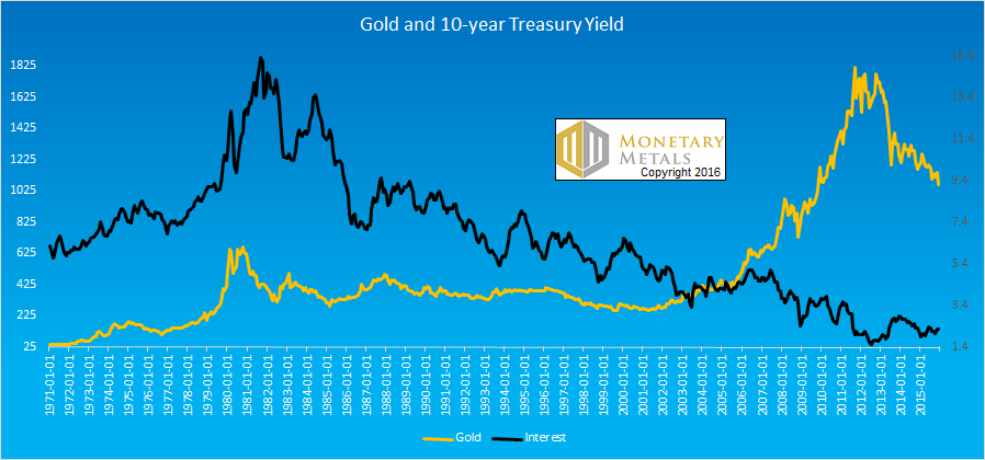 Every time we see this old saw, we wonder if anyone has access to historical gold prices and interest rates. Here’s a graph we published in our Outlook 2016.