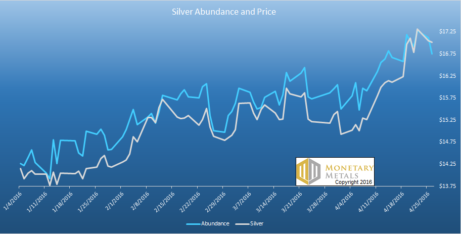 Then we thought we would go deeper. Here’s a graph showing the price action in silver since the beginning of the year, overlaid with our abundance indicator.