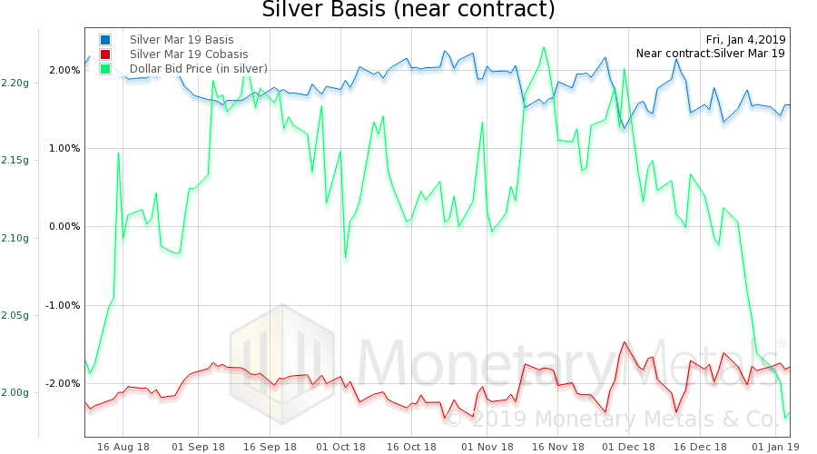 As the price of silver rose over 2% this week, the cobasis basically held steady. There is some buying of metal here, and some speculation too. This is not exactly the picture of a feeding frenzy, with an outlook of silver-to-da-moon. But nor is it a sign of a speculative blip, with a prognosis of a crash.