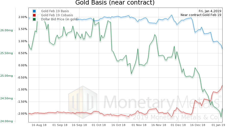 Here is the gold graph showing gold basis, cobasis and the price of the dollar in terms of gold price.