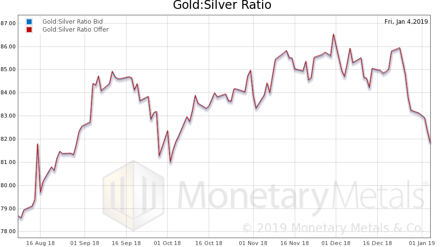 The price of gold went up four bucks, and the price of silver rose 32 cents. Silver has been going up in gold terms since the middle of last week, when the gold-silver ratio peaked at just under 87. It closed this week at just under 82 (a lower ratio means silver is more valuable). 87 is quite an extreme level. So it’s natural for there to be a move back down. But is this move durable, and likely to continue?