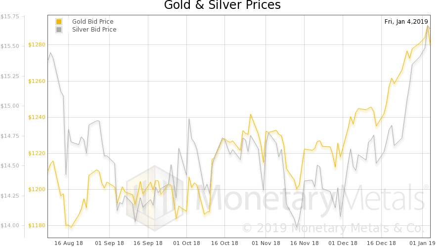 Let’s look at that picture. But, first, here is the chart of the prices of gold and silver.