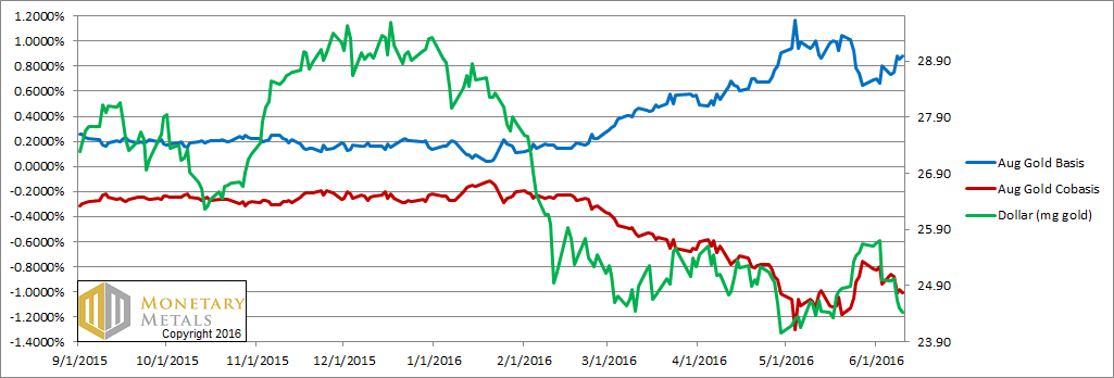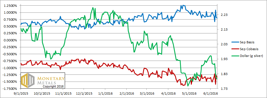 For each metal, we will look at a graph of the basis and cobasis overlaid with the price of the dollar in terms of the respective metal. It will make it easier to provide brief commentary. The dollar will be represented in green, the basis in blue and cobasis in red.