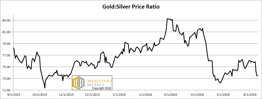 Next, this is a graph of the gold price measured in silver, otherwise known as the gold to silver ratio. The ratio was down about two and a half points.